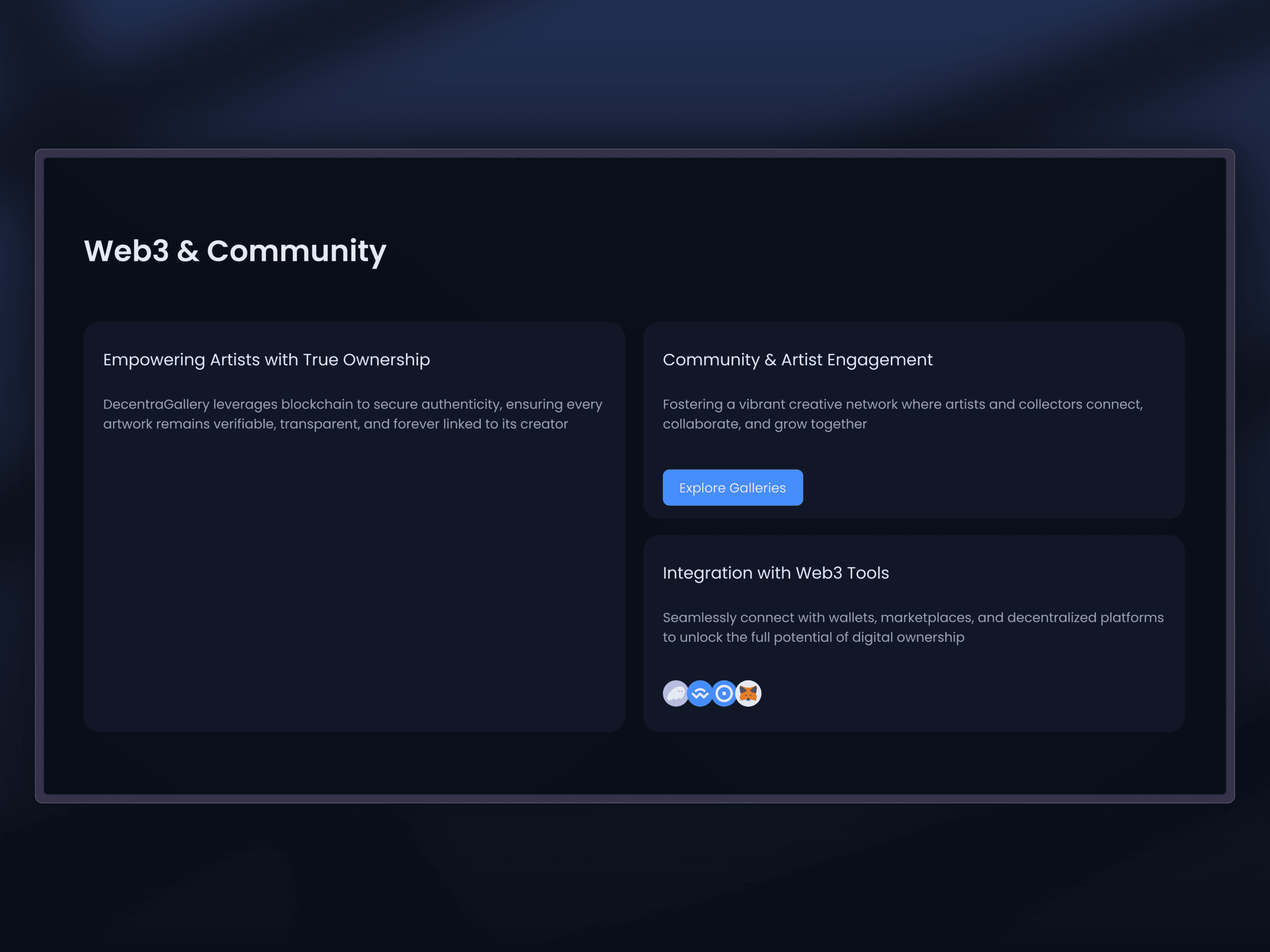 DecentraGallery is a Web3-powered platform designed to empower artists by providing a seamless space to showcase, sell, and own their digital artwork with full transparency. The aim was to bridge the gap between traditional art platforms and blockchain technology, ensuring a smooth onboarding experience for both Web2 and Web3 users.