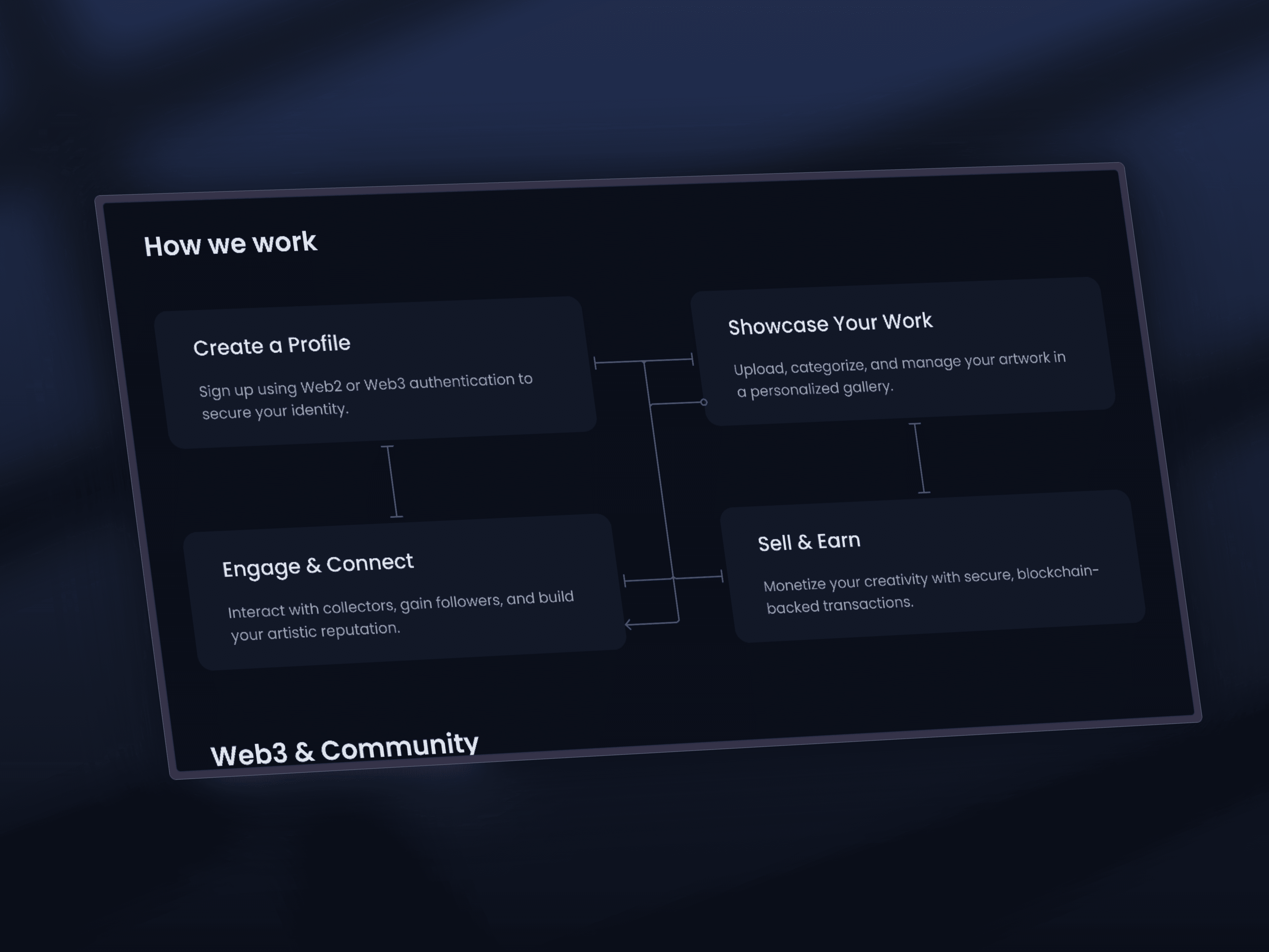 We analyzed existing Web2 art platforms (Behance, ArtStation) and Web3 NFT marketplaces (OpenSea, Foundation) to identify gaps in user experience.